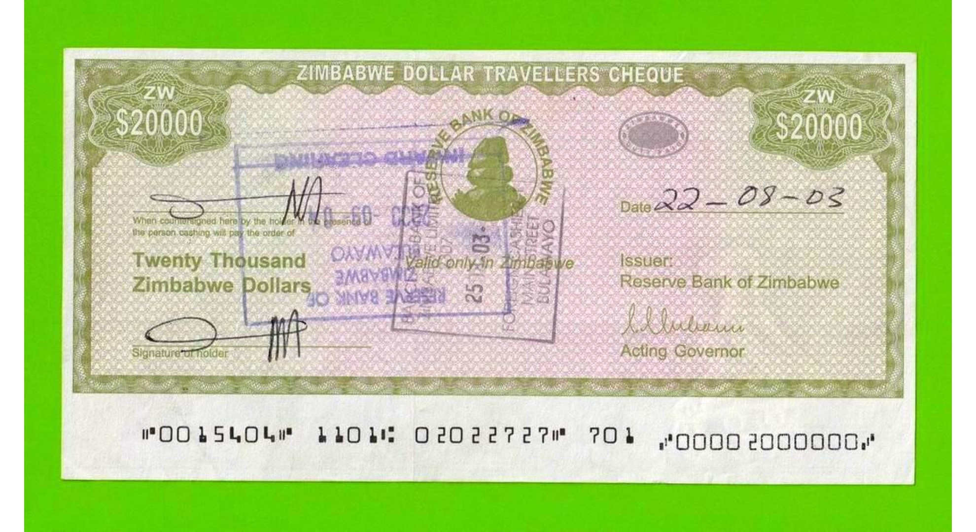 Зимбабве - 20000 долларов - Дорожный чек - 2003