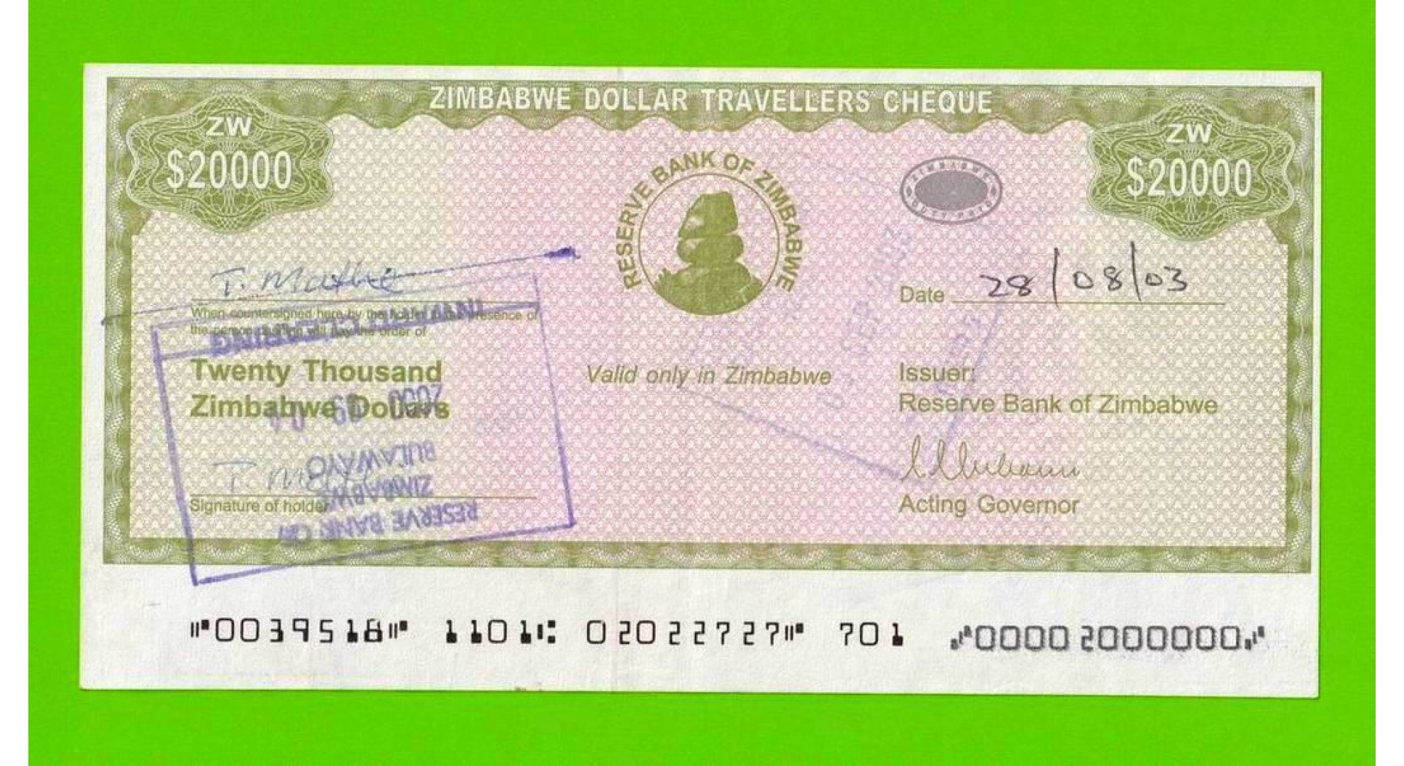 Зимбабве - 20000 долларов - Дорожный чек - 2003