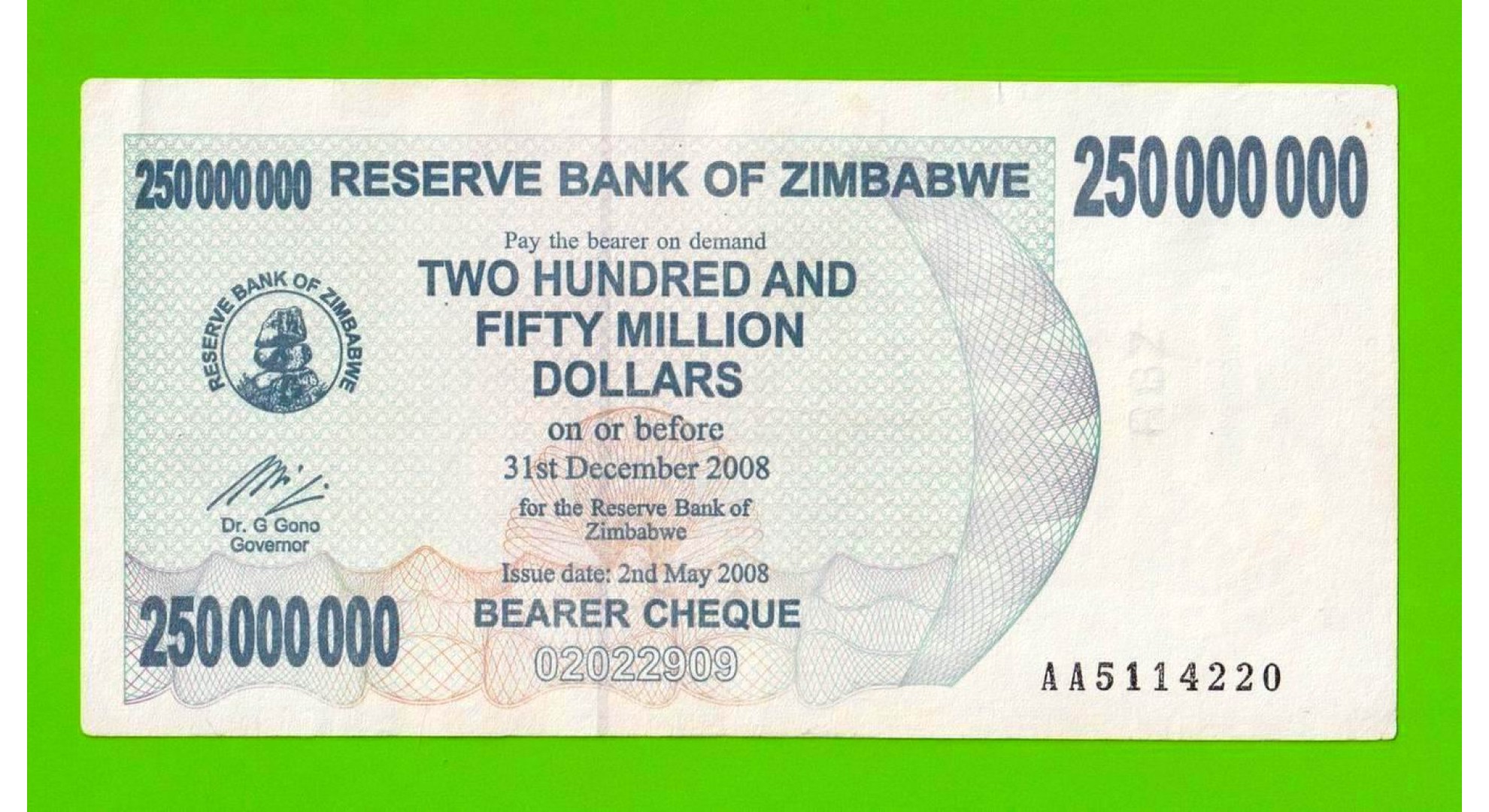Зимбабве - 250000000 / 250 миллионов долларов - 2008 (AA)