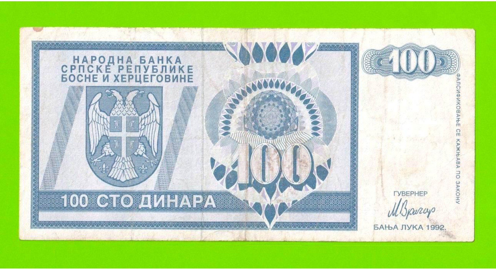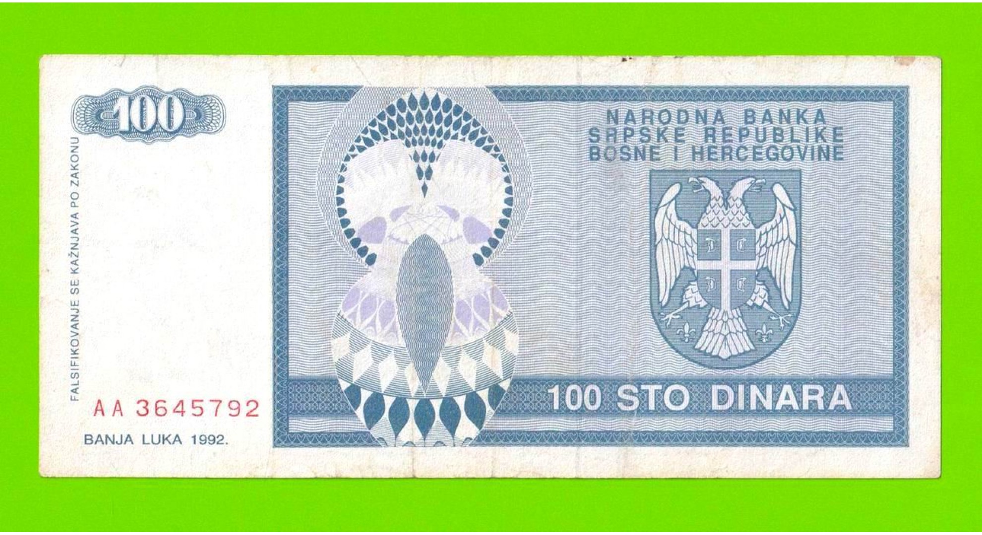 Босния и Герцеговина (Республика Сербская) - 100 динаров - 1992 (AA)