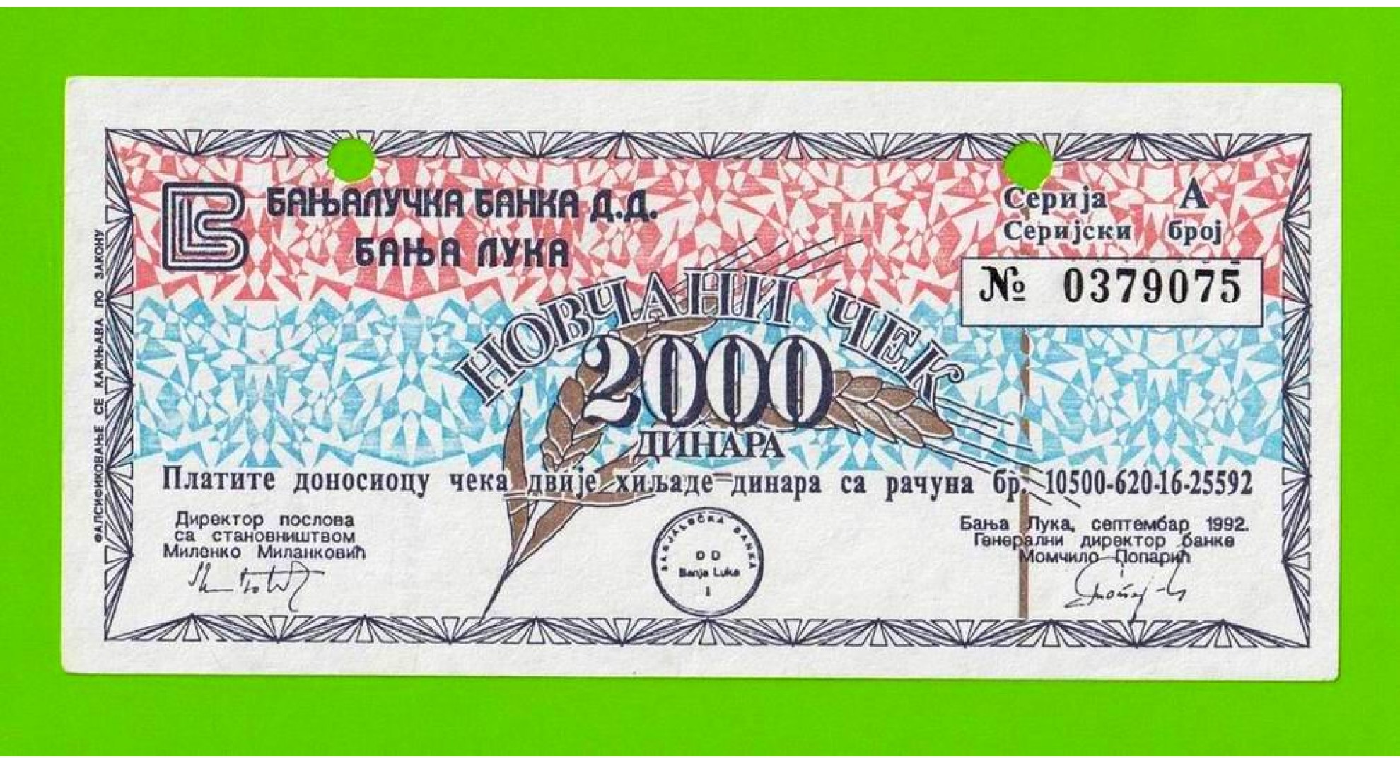 Босния и Герцеговина (Республика Сербская) - 2000 динаров - 1992 (погашен) - XF+!!!