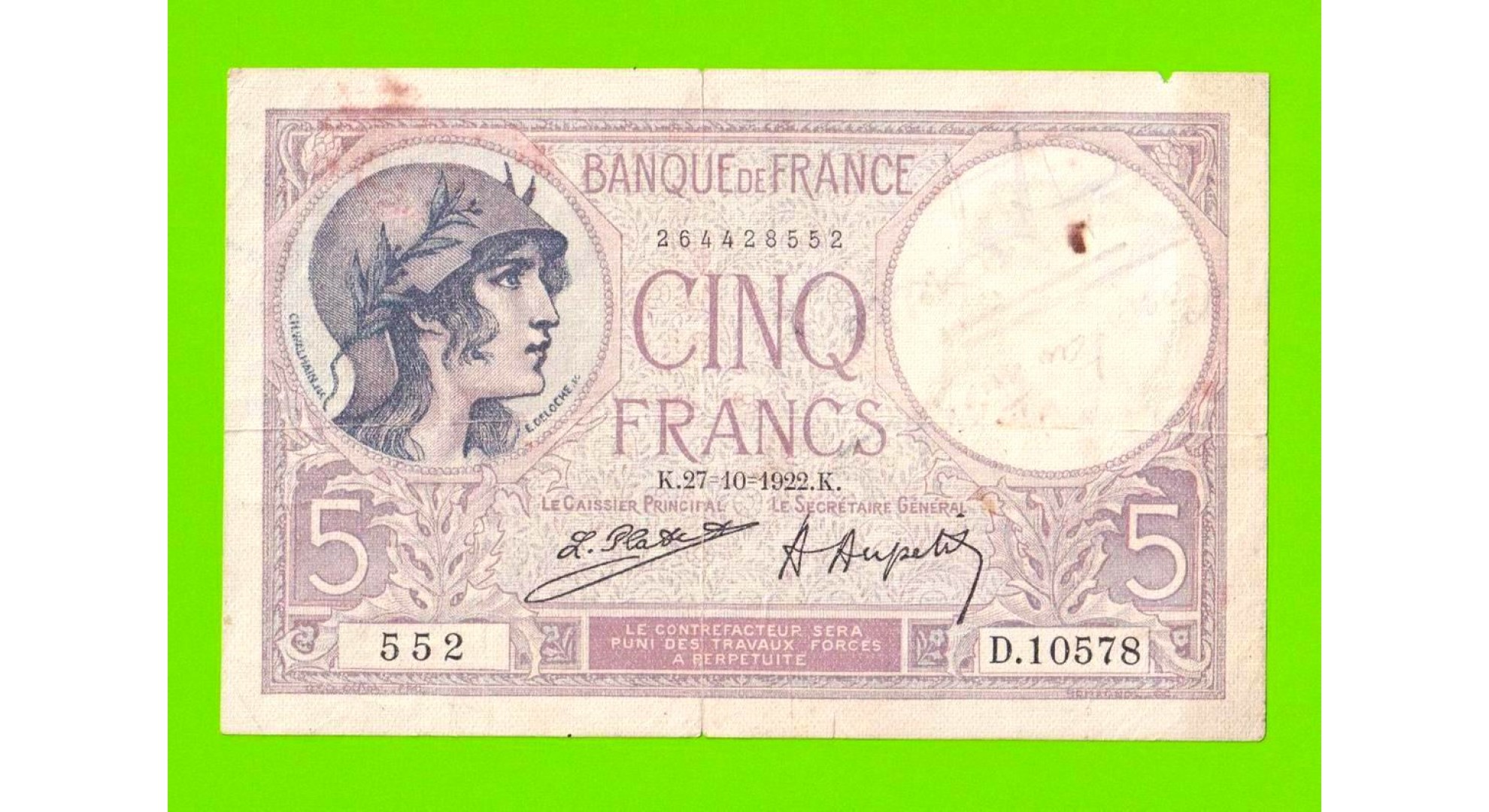 Франция - 5 франков - 1922 - надорвана по сгибу