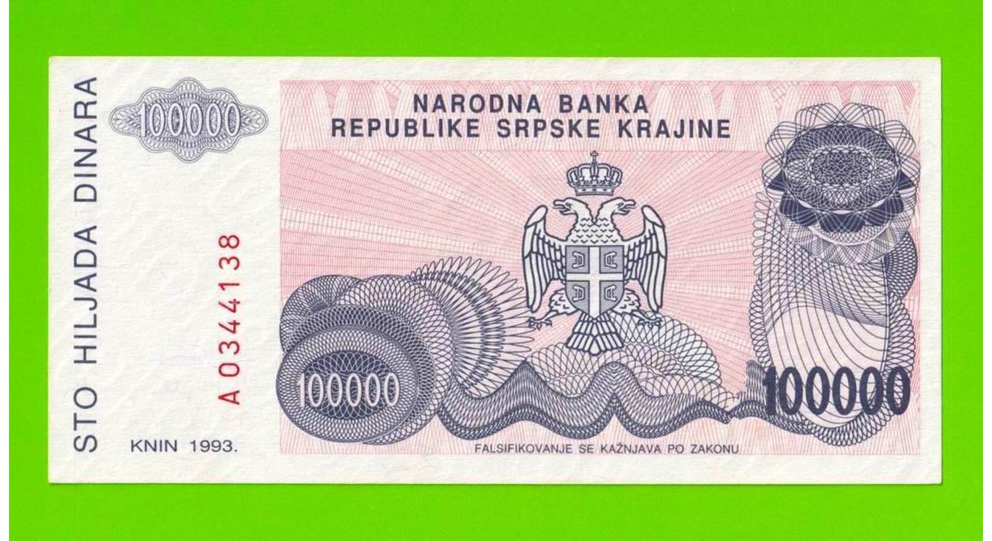 Хорватия (Сербская Краина) - 100000 динаров - 1993 (A) - aUNC!!!