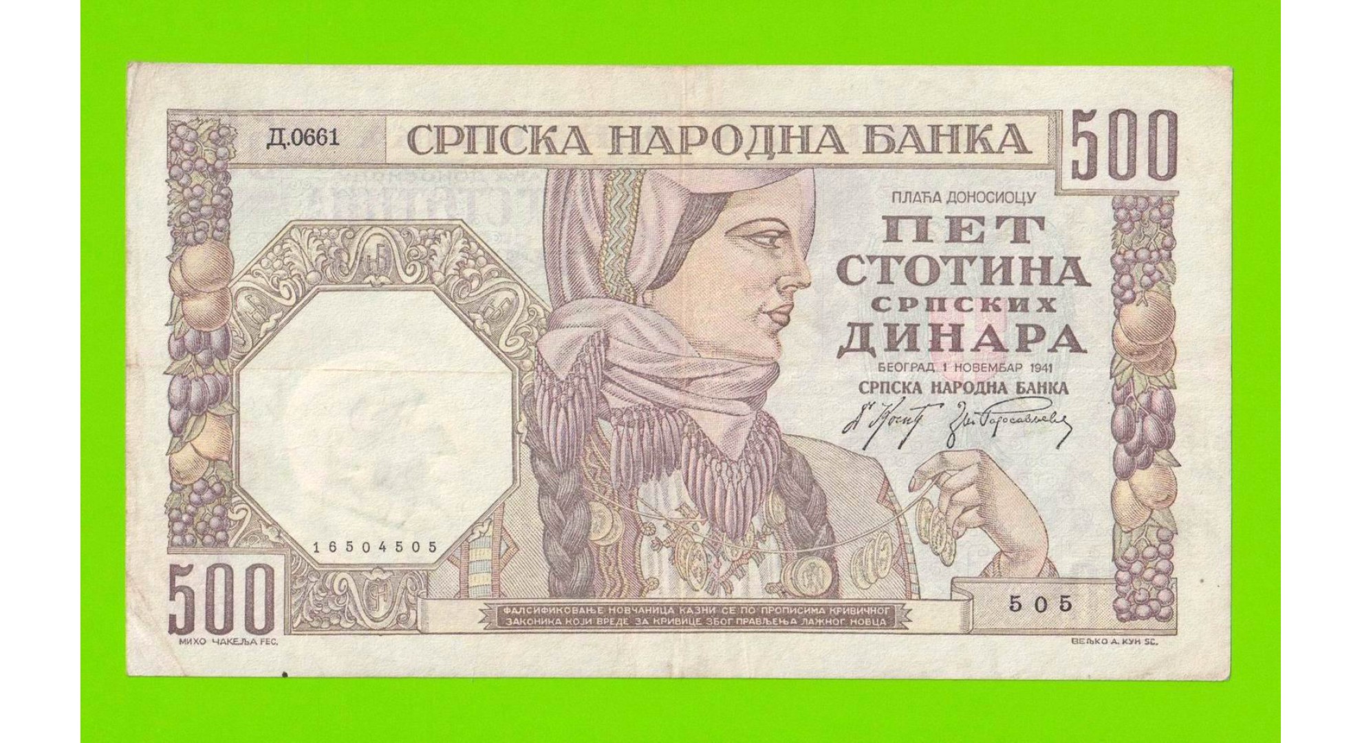 Сербия - 500 динаров - 1941 - в/з мужской профиль