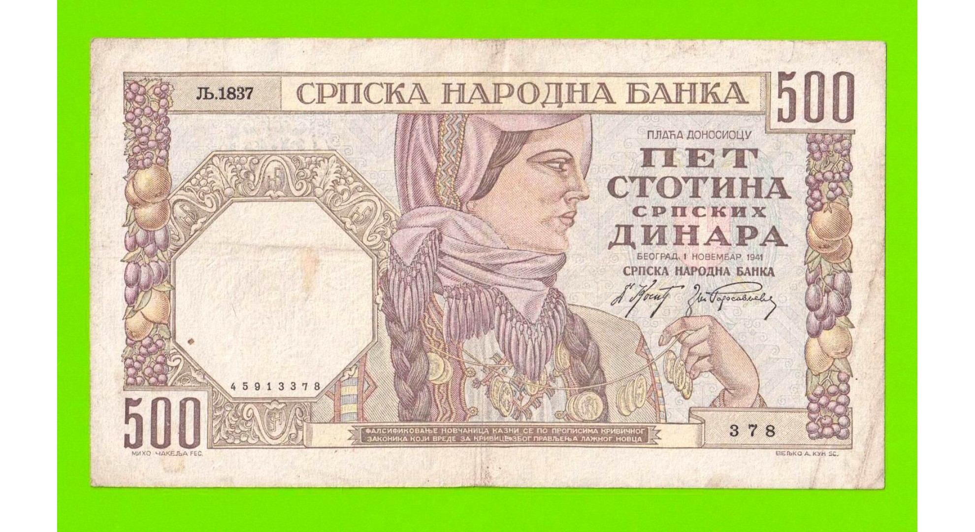 Сербия - 500 динаров - 1941 - в/з женский профиль