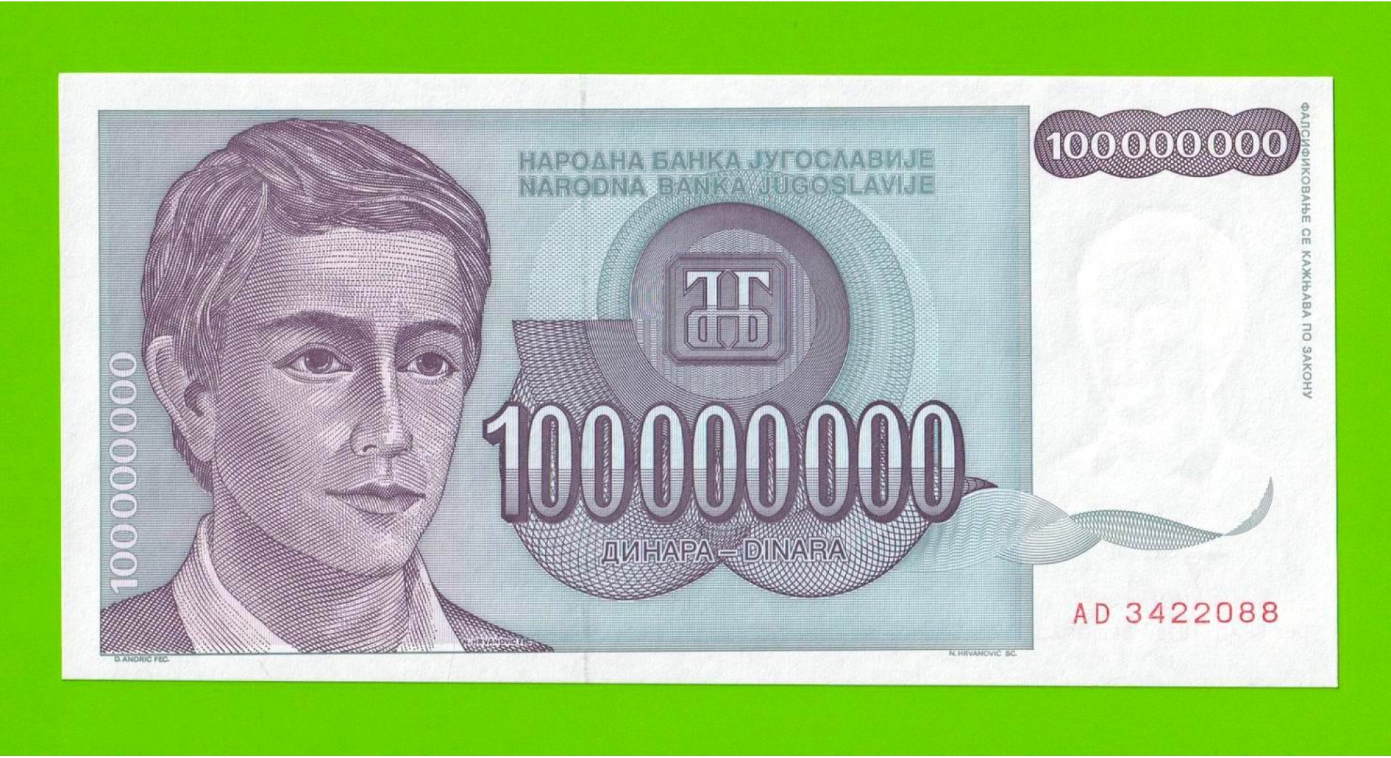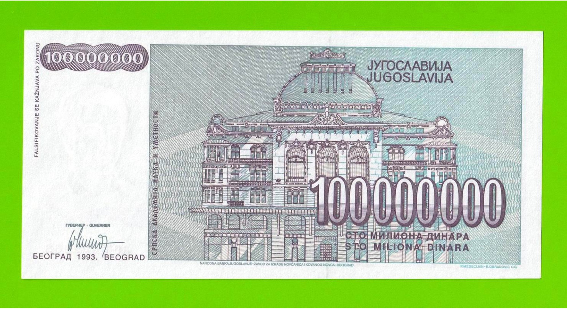 Югославия - 100 миллионов / 100000000 динаров - 1993 (AD) - UNC!!!