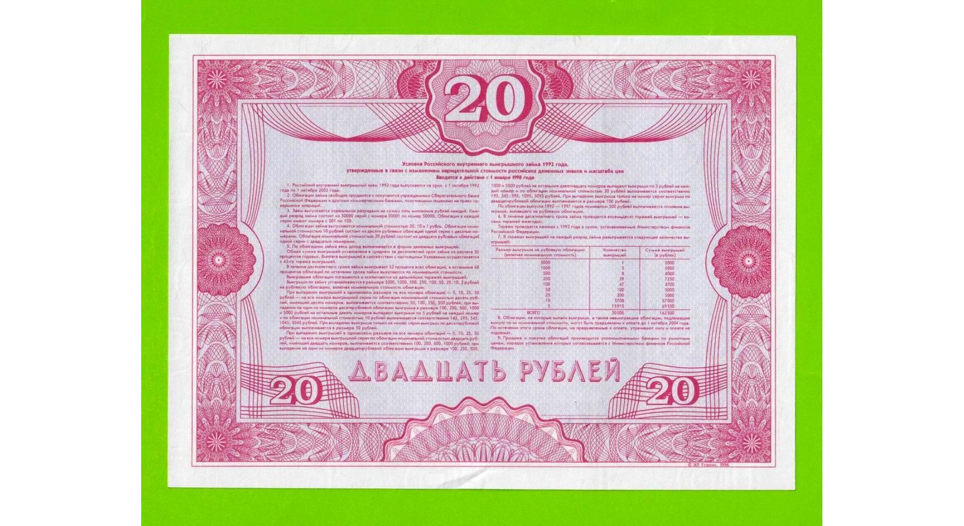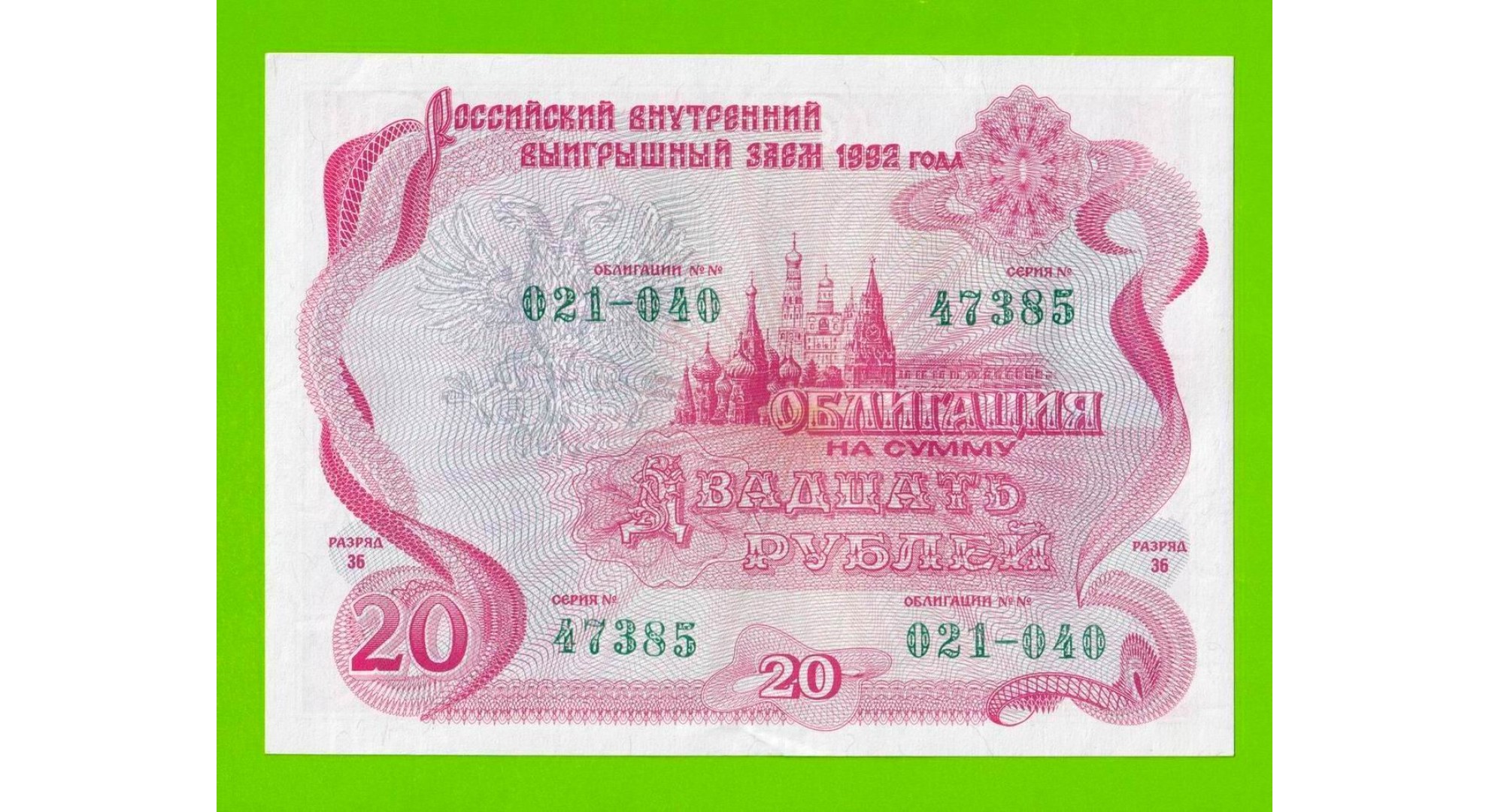Облигация - 20 рублей - 1992 - aUNC!!!