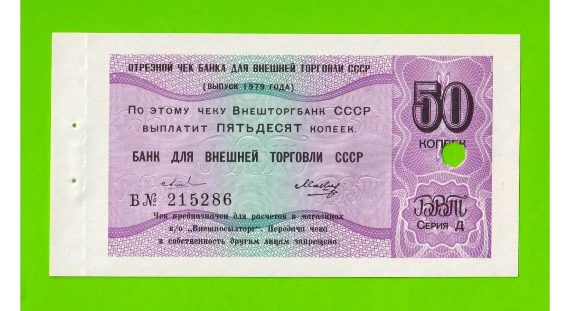 Внешторгбанк - чек на 50 копеек - 1979 - погашен - UNC-!!!