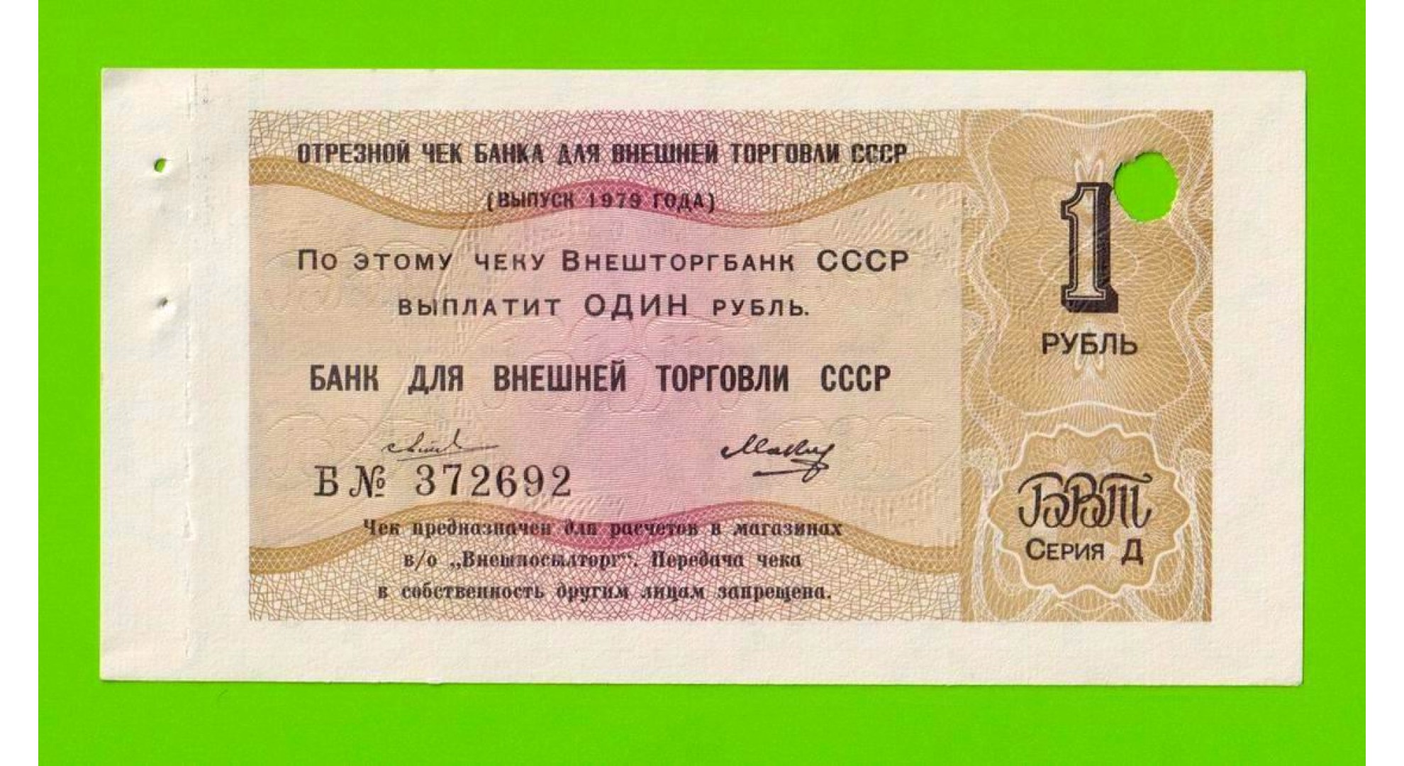 Внешторгбанк СССР - чек на 1 рубль - 1979 - погашен - UNC-!!!