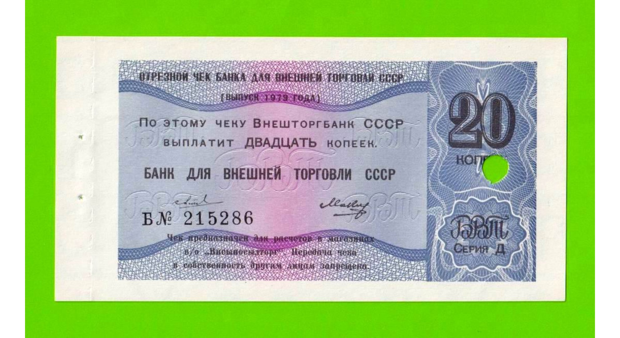 Внешторгбанк СССР - чек на 20 копеек - 1979 - погашен - UNC-!!!